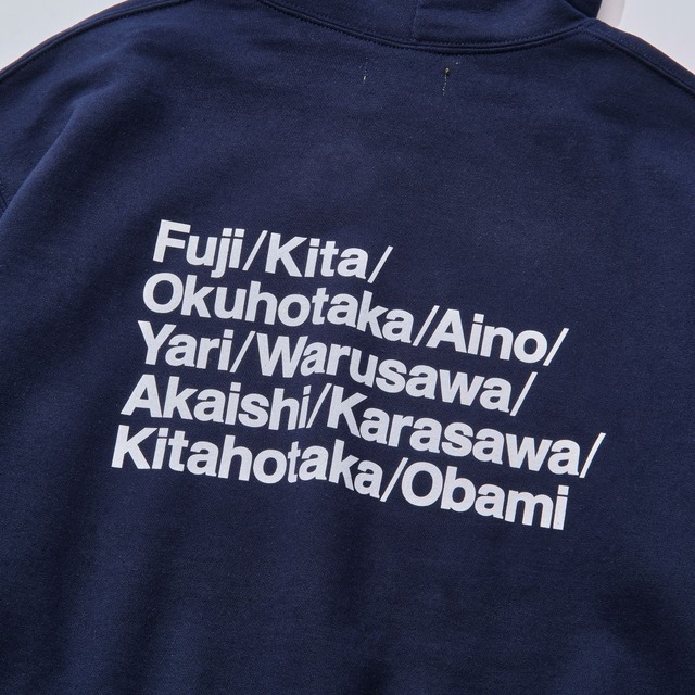 日本の山標高ベスト10をプリントした プルオーバーフーディ 軽くて速乾性の高いエアジェット糸を使用した裏起毛素材 シルエットはゆったりめになっています Color:NEON YELLOW/NAVY